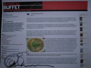 “This is a blog that I wrote for my website The Magical Buffet sir,” I started. Surprising myself that my voice was steady and calm. “Your love of pho inspired me to go out and find a place to try it. I liked it so much I wrote about it and dragged a bunch of friends out to try it.” He signed the print out I put in front of him, and said that was “Excellent.” I stood beside his chair for a photo, which unfortunately turned out blurry, and thanked him again. Then it was over.
