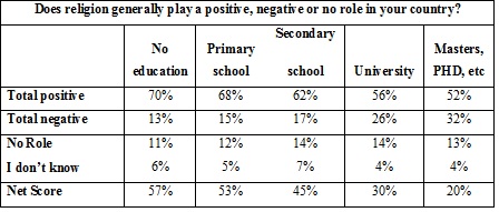 The data also shows a clear correlation between the level of education people have received and their perceived positivity about the role of religion in their country. The results would suggest that those who have been educated to Masters or PhD level have 20% lower net positivity compared to those who have had less education. The results also showed that net positivity increased gradually to an average of 57% for those who have no education at all. The table below highlights this staggered increase: