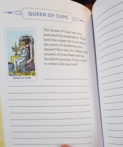 Carlson’s approach is simple in appearance, but has the potential to create personal, long-lasting, connections to the tarot. “How to Learn Tarot” dedicates a page to each tarot card, showing it in the corner of the page. She provides a prompt and encourages the reader to write down all their thoughts and associations with the card. No wrong answers. The act of writing helps you remember what you are learning, and creating an idea makes it personal to you. The back of the book includes keywords associated with each card, but Carlson encourages you to go through the entire journal, which includes exercises and sample spreads, before browsing the keywords.