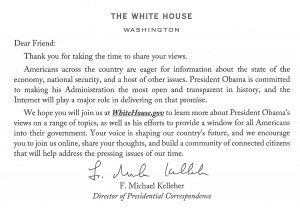 However, I did promise that I would share with you any responses I receive. Well, at the beginning of April I received what you might call a “reply”. I was sent a post card from F. Michael Kelleher, Director of Presidential Correspondence. It reads as follows: