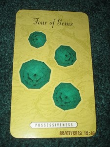Public service announcement aside, let’s return to Elizabeth’s relationship question. First, to examine the theme for this relationship in the near future, the Four of Gems. This card’s suit is unique to The Lover’s Tarot and in other traditional decks may be termed “coins” or “pentacles”. The Four of Gems indicates that this relationship grows out of a desire for security. Some of this desire is physical security in all its forms- the comfort of knowing each partner is there, the satisfaction of finding balance and harmony in a partnership and the stability of combining material resources, abilities, and assets. There is a sense of satisfaction and harmony in this relationship especially in tangible ways that each partner seems to provide what the other has been missing. There is a feeling with this card that this relationship is grounded in practical matters and it may seem that mundane issues such as money and property are of great concern. There is an equal stake for both partners but much of this relationship rests on material and physical security. The desire for stability is essential and so both partners may look to each other for such stability. There is a strong attraction but its primary focus is grounding rather than emotional. It seems this relationship will develop in a way that emphasizes problem solving, practicality and sharing resources. A possessive side may be developing in this relationship as well however. Be mindful of red flags that this relationship is becoming more about security than actual emotional attraction. Be mindful of the attraction to what it seems you could have together trumping the attraction of how it feels to be with this person. There is potential for harmony on a material/physical/ and practical level but this stability may also yield dependency, clinging to the status quo and resisting change. There will be a desire to hold on to property, money, physical routines and comforts that potentially interferes with the emotional bond or even emotional growth as a partnership. Be very cautious about the potential for possessiveness on both sides of this relationship. It seems the tendency will be to engage in battles of will and the significant other may come to regard Elizabeth or her belongings/property or money with a sense of entitlement or ownership. Be mindful of how resources and assets are dealt with in this relationship. It seems boundaries will need to be clear to avoid stagnation and prioritizing comfort and security over growth and emotional well being. The number four will also be significant as this relationship proceeds. Be on the look out for four types of material resources that become significant to this relationship.