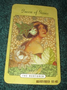 As February’s cold dark days bring the desire for warmth and comfort, relationships are in focus. Passion and romance are on our minds, and in case we forgot, there is always Valentine’s Day to remind us of our desire to share our lives with others. This month’s Querent is a woman we will call Elizabeth. Elizabeth has concerns about her budding romance, a long distance relationship with a man who seems to hold some promise of development both in terms of commitment and attraction, but with whom she remains uncertain. Pursuit of this relationship will entail risks and she is proceeding with caution, and looking for guidance for the long term growth of this relationship, any potential obstacles. She would also like to gain a sense of where his intentions lie in this relationship. In honor of Elizabeth and the atmosphere of Valentine’s romance, this month’s deck is The Lover’s Tarot. Her reading reveals the Four of Gems, Queen of Gems and The Death card, reversed.